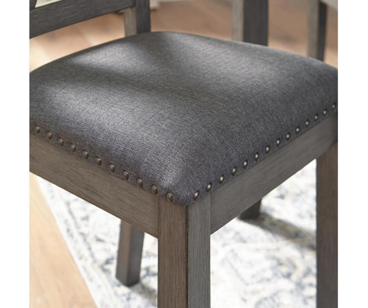 Perfect portion. Striking a simply chic pose, this dining set is styled with fascinating flair. Subtle gray wash finish gives the clean-lined design a casually cool sensibility, while each chair’s plush cushioned seat in a soft, neutral upholstery adds to the allure.