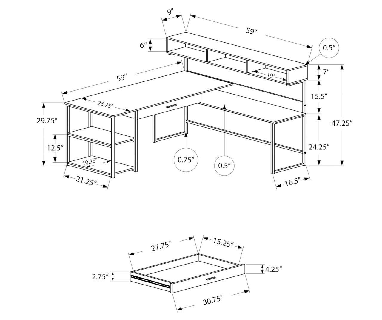 Let this L-shaped corner desk inspire you with its practical and modern industrial aesthetic. It starts with a smooth laminate finish on all sides in a chic dark taupe woodgrain finish accented with strong black metal framing. The numerous storage options include a wide drawer on metal glides with a sturdy black handle alongside an open cubby and two fixed bottom shelves for books, magazines or even a small printer. The side station is so useful with three spacious cubbies on top for all your work essentials.