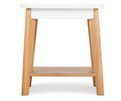 - Exposed feet with a faux wood finish