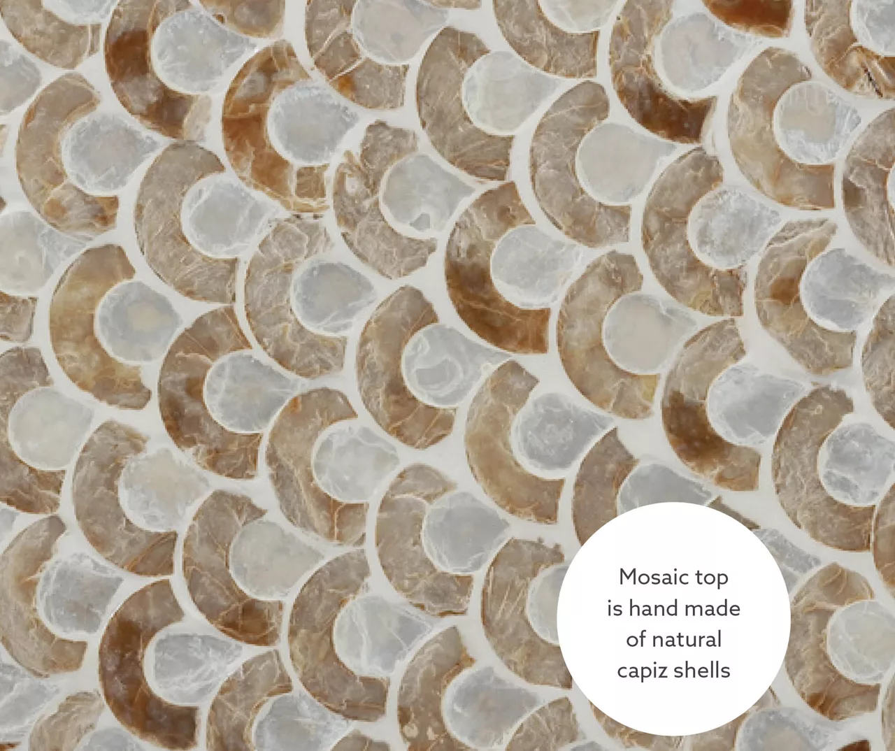 This modern accent table blends subtle shapes and curves with a coastal flare. Adds a splash of accent in event the smallest of spaces. Featuring a gold bent tube frame and neutral capiz shell finish on the table top, this unique piece will serve as a beautiful accent in nearly any decor. This round table is perfect for displaying small decor items such as candles, vases and pictures frames.