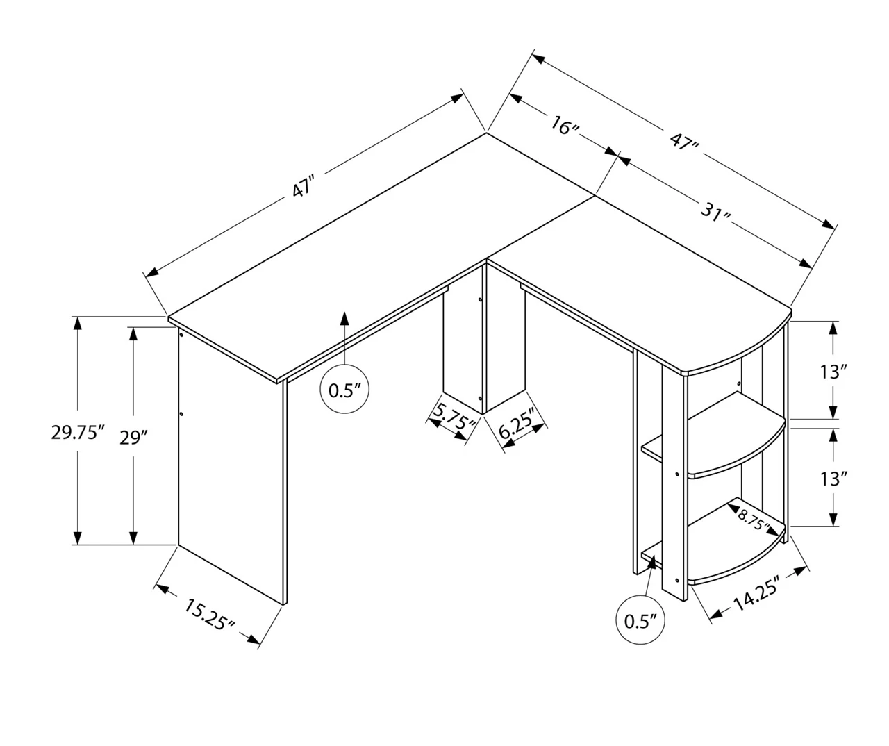 With a generous worksurface and built-in storage, this L-shaped computer desk is ideal for students or home offices with limited space. Two convenient storage units provides space to neatly organize reference books and school supplies. Finished on all sides in a wood-look laminate, this space-saving juvenile and versatile desk is intended for placement in a corner but can be positioned anywhere in a child’s bedroom, dorm room or home office.