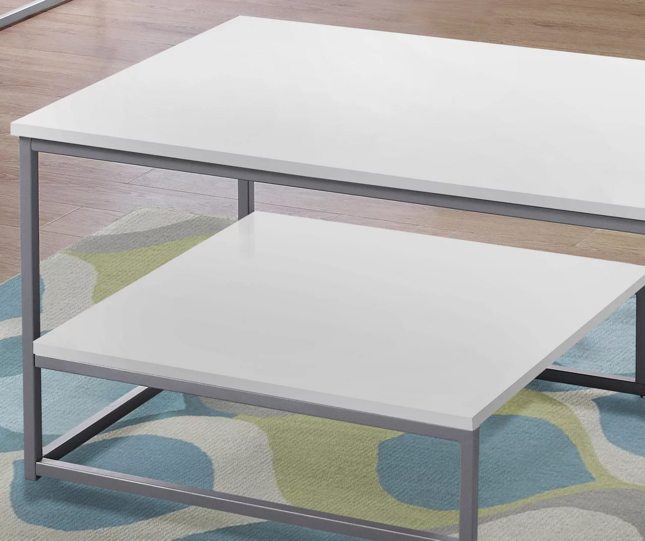Bring a fresh modern update to your living space with this unique three piece coffee table set. The simple contemporary design in a warm, dark taupe laminated wood-look finish and black metal trim accent provides a spacious table top with a raised bottom half shelf for additional storage and display. The matching end tables are perfect to place a lamp, pictures, or other stylish decor while the coffee table will be an attractive focal point in your living room, den or family room.