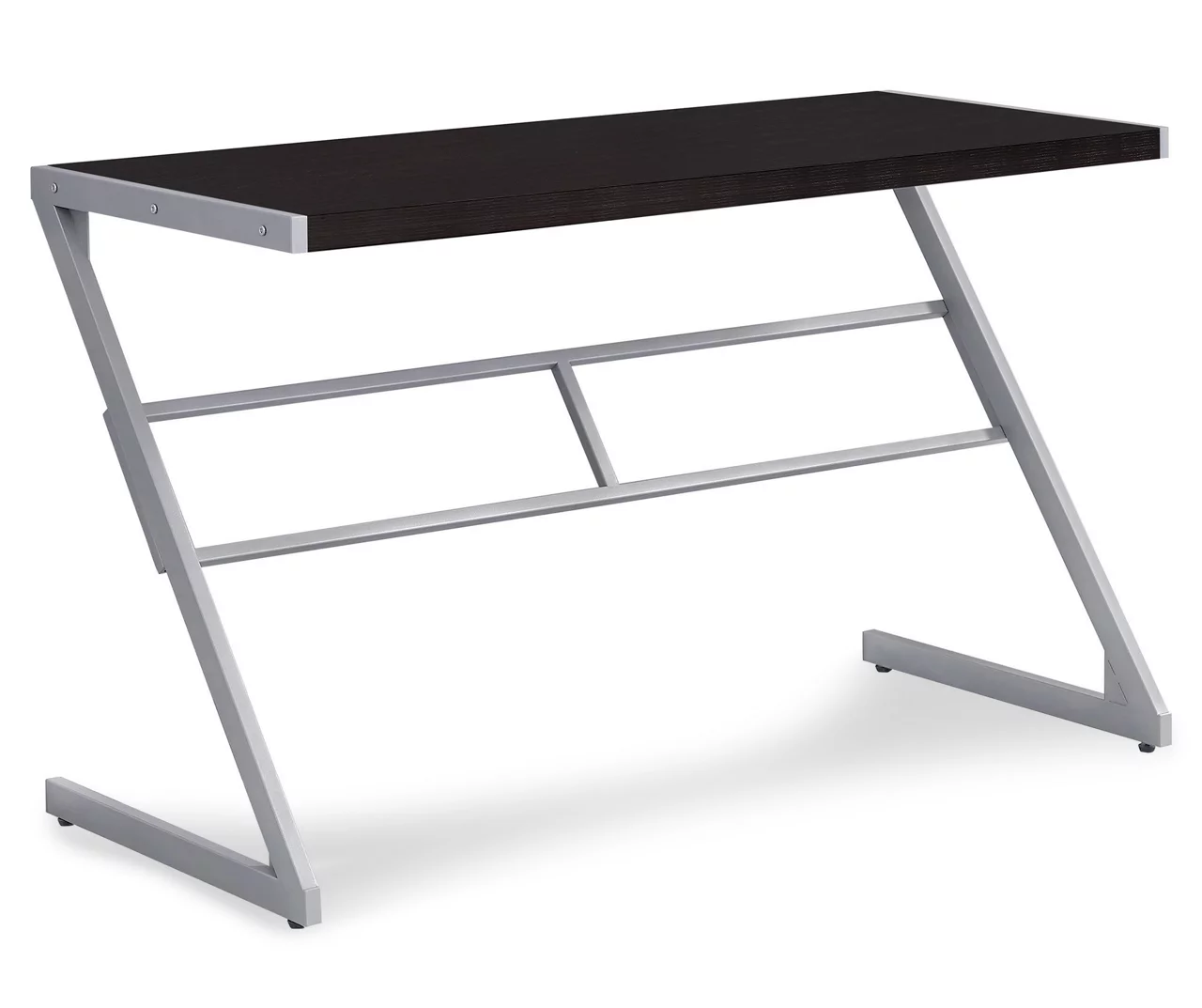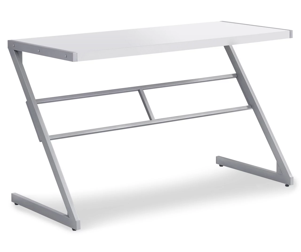 With a sturdy Z-shaped silver frame lends contemporary look to any home office, living room, or guest bedroom. The ample surface offers plenty of room for a monitor, laptop, lamp and other office essentials. Its compact size, finished on all sides, makes a great addition to a smaller home office, studio or dorm room.