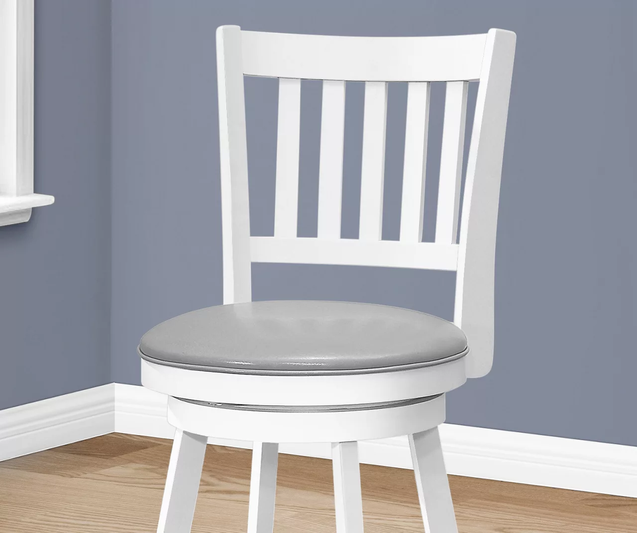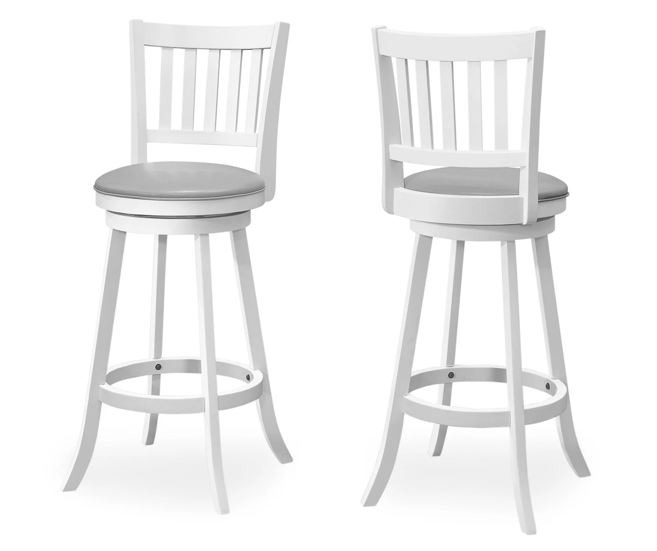 These counter-height swivel barstools with backs have a style that is as timeless as it is versatile. Gently curved backrests offer support and feature a classic slat-back design. The seats are cushioned for a soft feel and upholstered in a smooth, black leather-look fabric. The round shape of the padded seats mirrors the ring-shaped footrests below that offer a place to relax your feet. Flared solid wood legs provide stability when the seats are rotated 360 degrees, and are in the same rich, dark-brown espresso finish as the backrests and footrests. Sold as a set of two, these traditional stools are a great choice for a kitchen island or a casual dining area with a counter-height table.